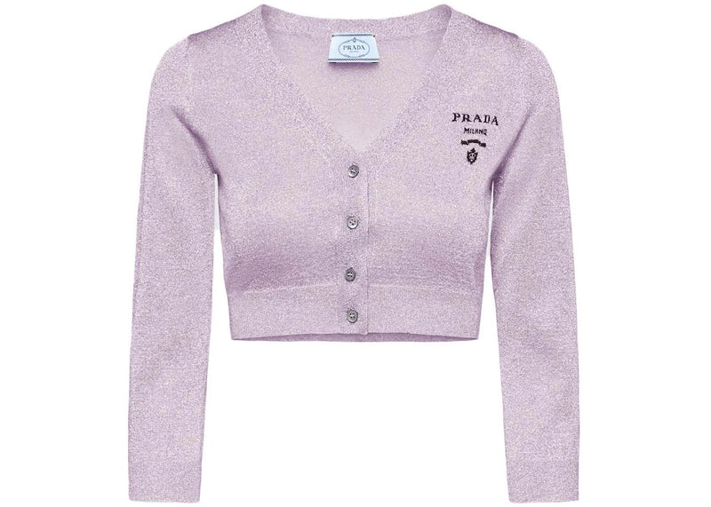 The Prada Cropped Lurex Cardigan Sweater Lilac is now available at Side Kicks!