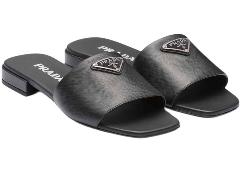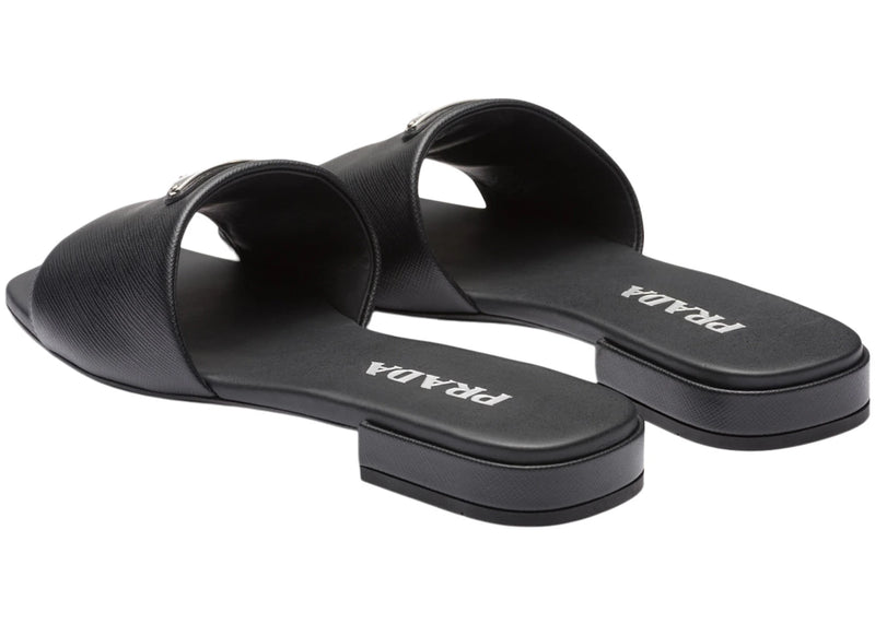 The Prada Logo Slide Sandals Black Saffiano Leather is now available at Side Kicks!