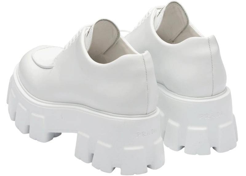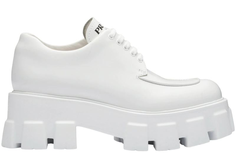 The Prada Monolith 55mm Lace Up Loafer White Brushed Leather is now available at Side Kicks!