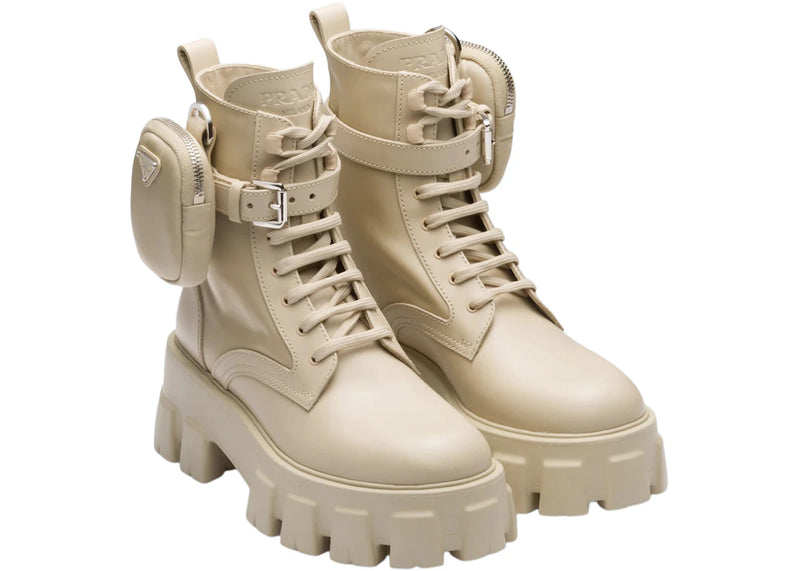 The Prada Monolith 55mm Pouch Ankle Boots Desert Beige Leather is now available at Side Kicks!
