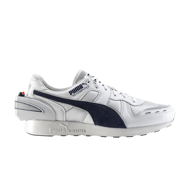 The PUMA RS-Computer Shoe integrates electronic hardware and software for advanced running metrics. The 2018 version updates the 1986 original with USB charging, Bluetooth connectivity, and a dedicated app for tracking steps, distance, and calories. It features a Lunar Rock – Limestone – Peacoat colorway and limited global release of 86 pairs, each numbered inside the tongue. Sensors include a 3-axis accelerometer, and LED keys display step targets and battery status. Released on [date], the PUMA RS-Computer Shoe is available now at Side Kicks.