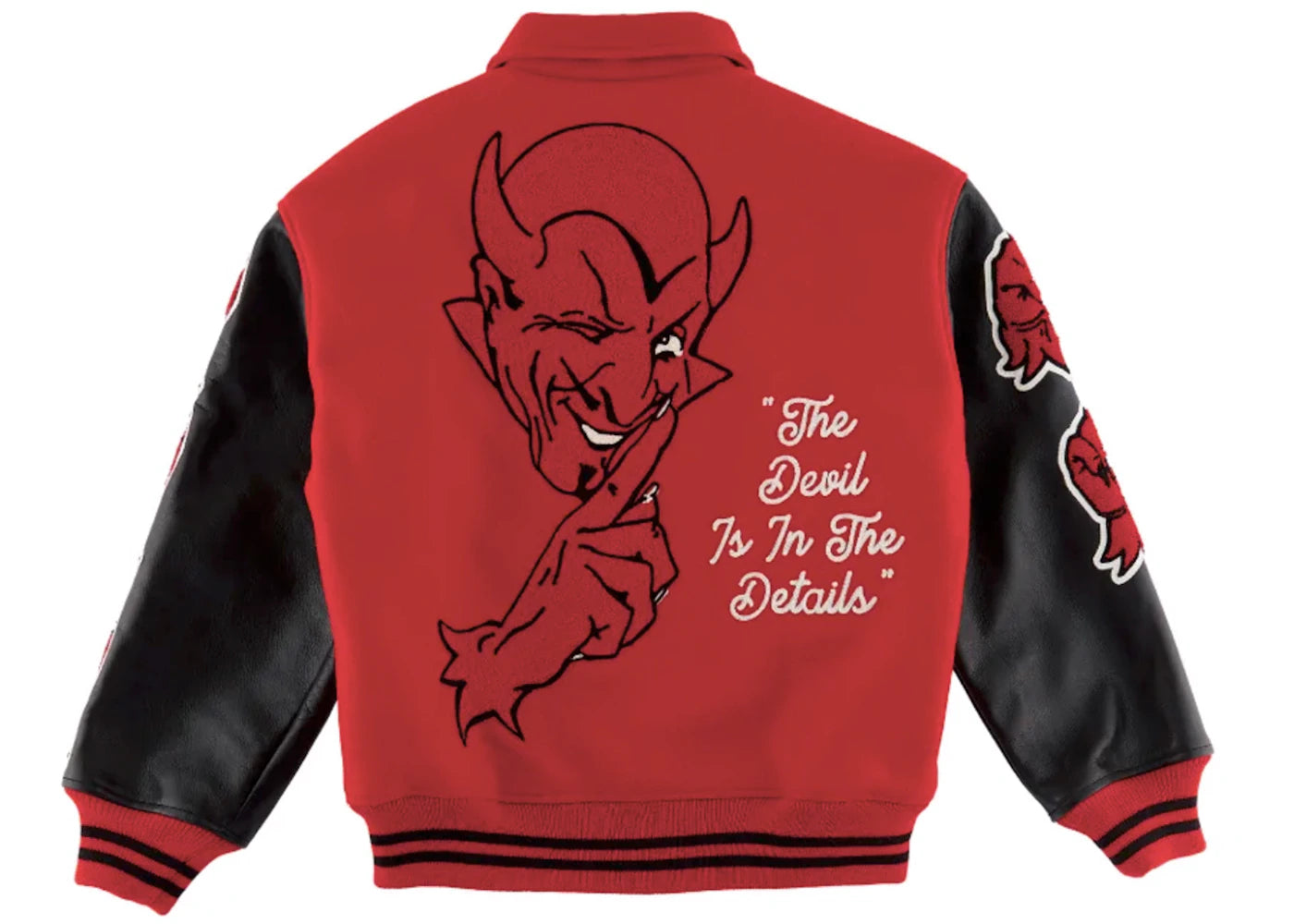 The Saint Mxxxxxx Devil Varsity Jacket Red is now available at Side Kicks!