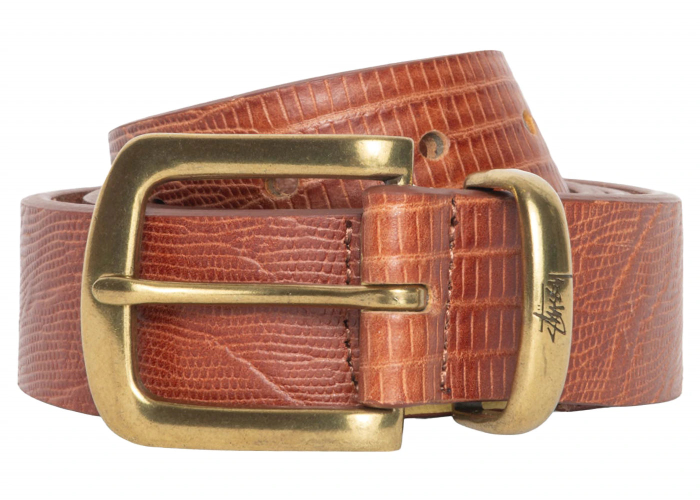 The Stussy Lizard Texture Underlay Belt Cognac is now available at Side Kicks!