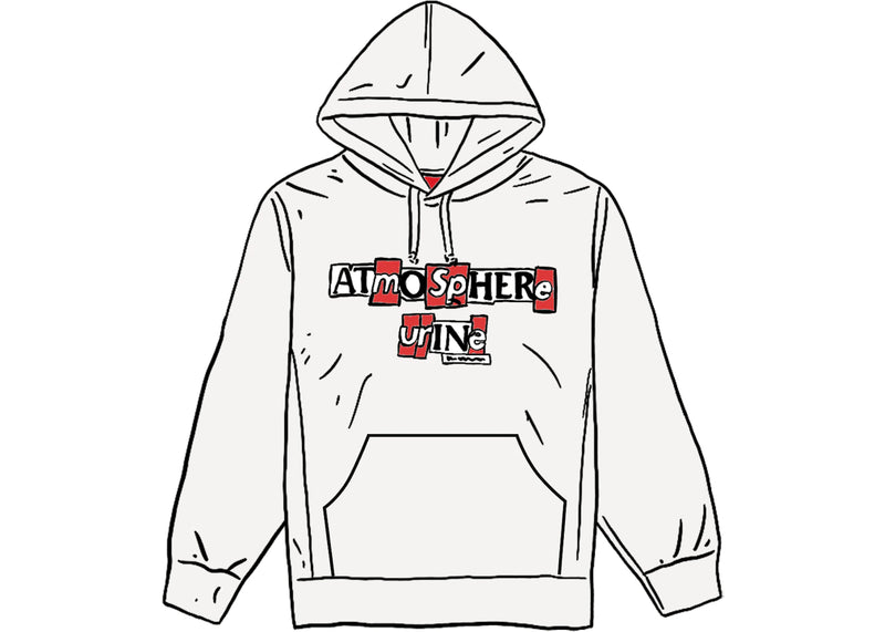 The Supreme x Antihero "Atmosphere Urine" hoodie features a ransom-note-style chest print combining both brand logos. Released on November 27, 2020, the Supreme x Antihero hoodie is available now at Side Kicks.