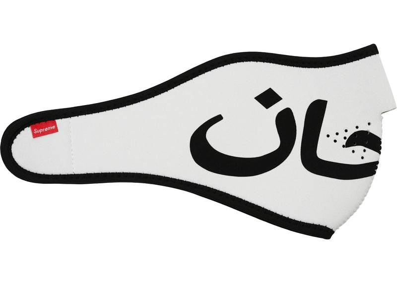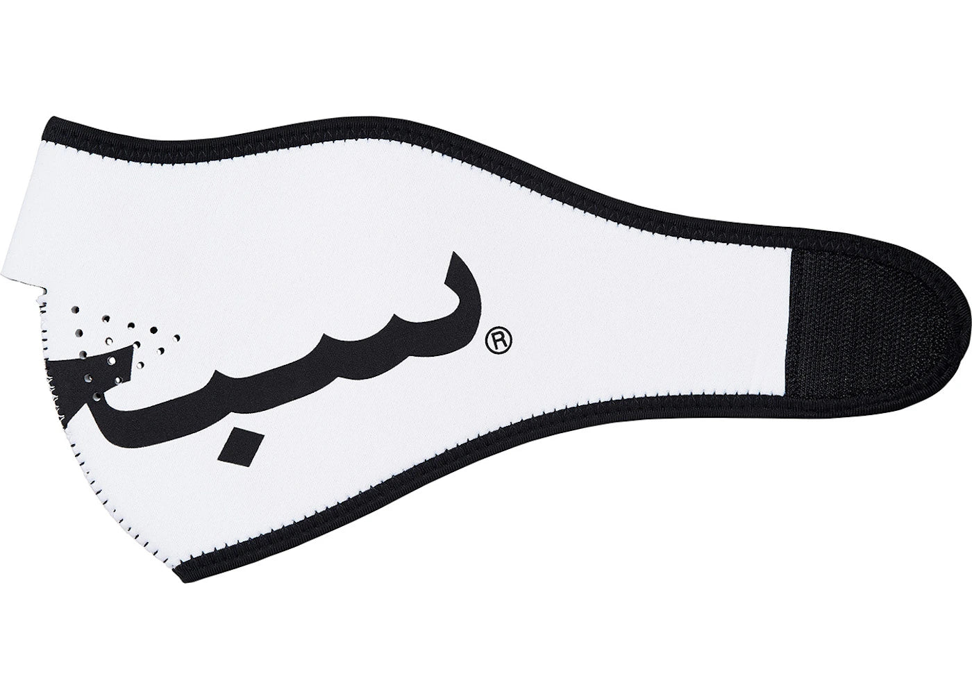 The Supreme Arabic Logo Neoprene Facemask features neoprene fabric with velcro closures and displays the brand's Arabic logo. Released on December 21, 2017, the Supreme Arabic Logo Neoprene Facemask is...