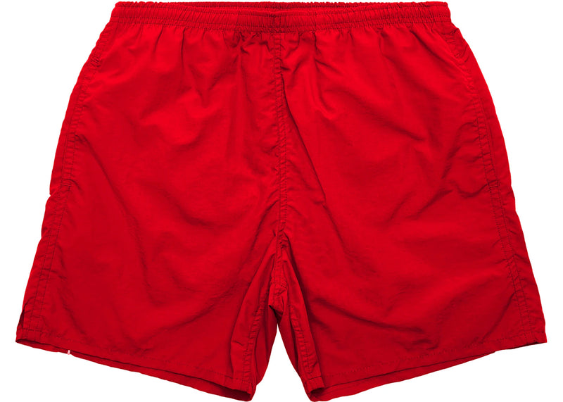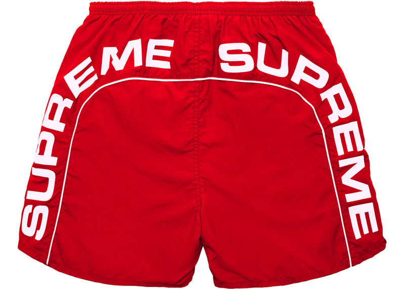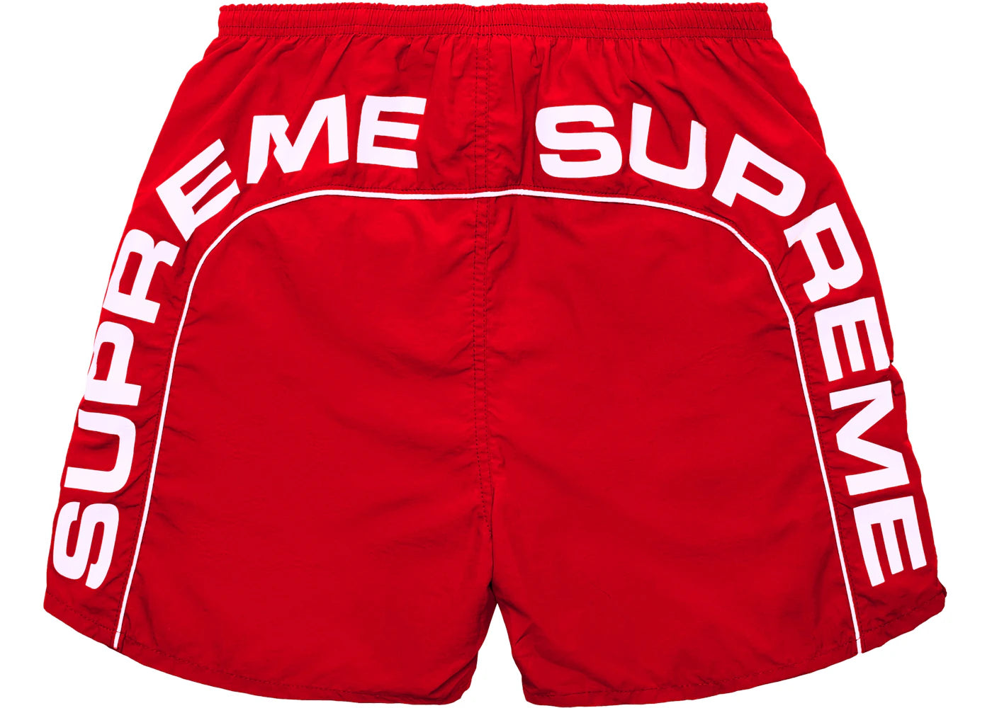 The Supreme Arc Logo Water Short Red is now available at Side Kicks!