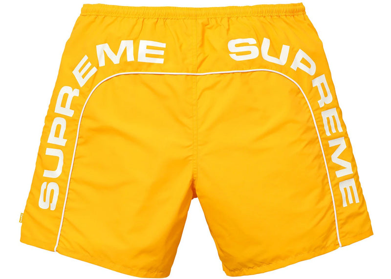 The Supreme Arc Logo Water Short Yellow is now available at Side Kicks!