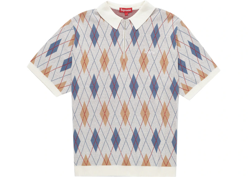The Supreme Argyle Zip Polo White is now available at Side Kicks!