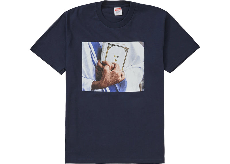 The Supreme Bible Tee features an image of an elderly priest holding a bible with a Supreme Box Logo. It released in eight color options as part of the FW19 Week 7 drop. Made from cotton, the tee offers a standard fit with a screen-printed graphic. Released on October 10, 2019, the Supreme Bible Tee is available now at Side Kicks.
