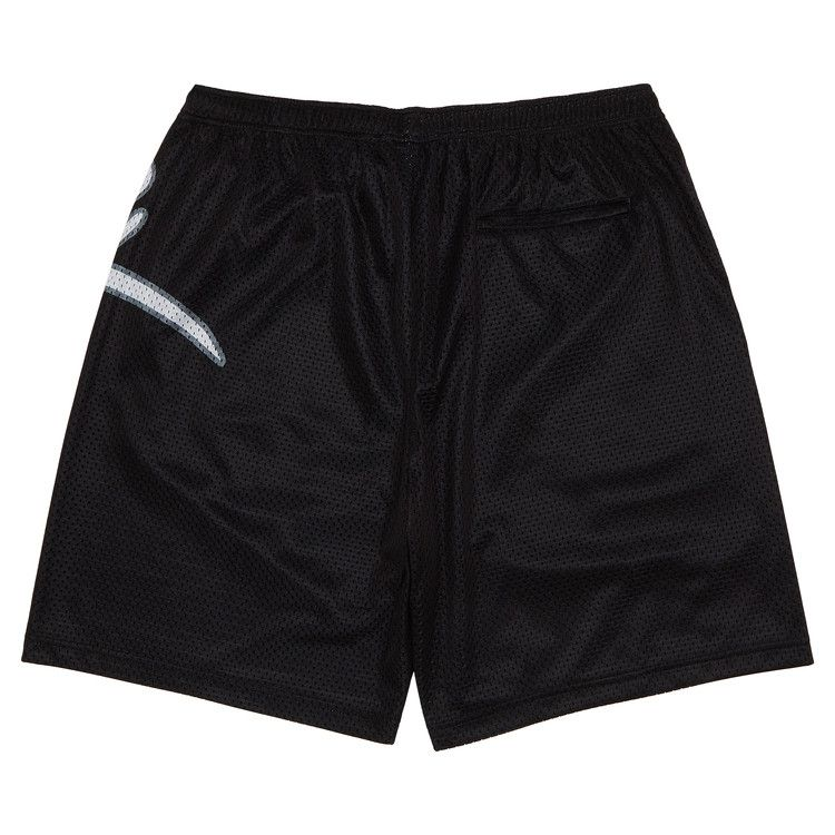 The Supreme Big Script Mesh Short in the color black features a breathable mesh fabric construction, ideal for workouts or casual wear. These shorts are designed with a prominent Supreme logo script detail, an elastic waistband with drawstring closure for a comfortable fit, and side pockets for added functionality. The minimalist black color offers versatility for various outfit pairings.