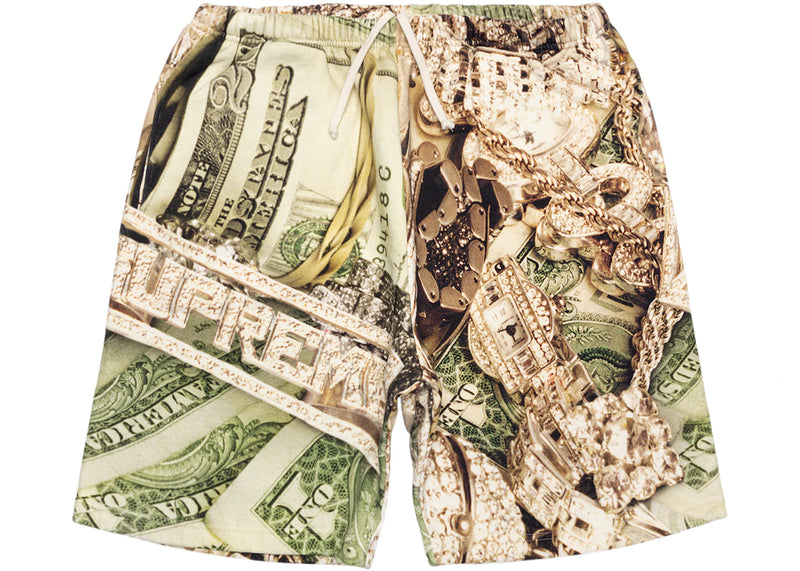 The Supreme Bling Sweatshort features an all-over print pattern of money and jewelry, matching the SS20 Week 5 hooded sweatshirt. Made from cotton, it includes an elastic waistband and side pockets for functionality. Released on March 26, 2020, the Supreme Bling Sweatshort is available now at Side Kicks.
