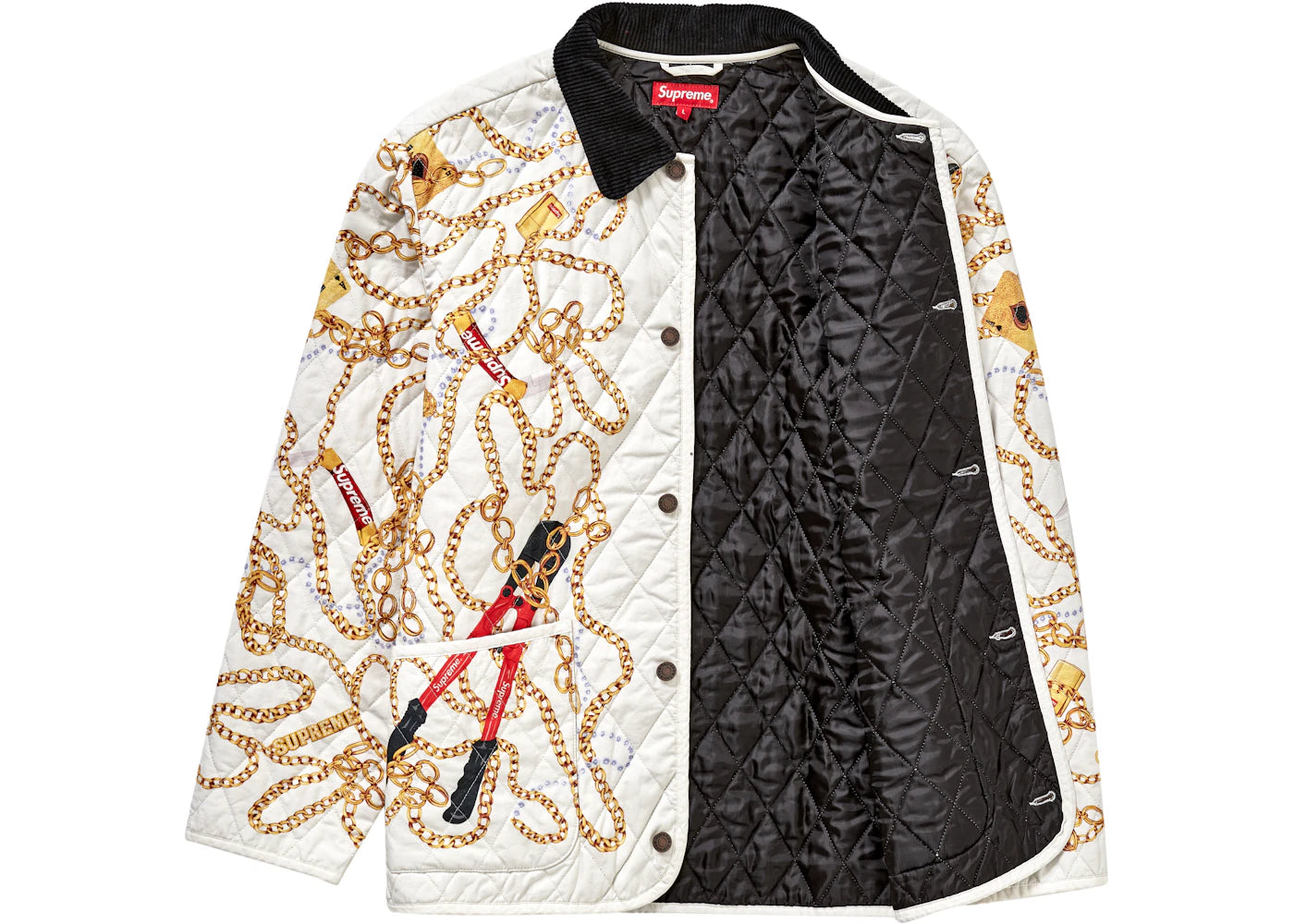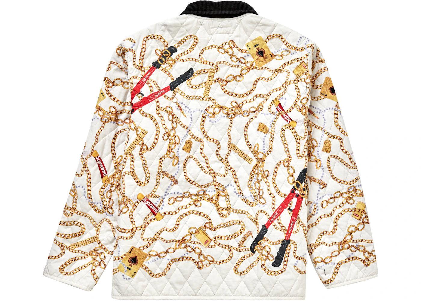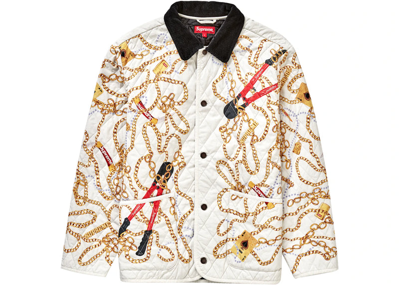 The Supreme Chains Quilted Jacket White is now available at Side Kicks!