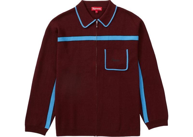 The Supreme Chest Stripe Zip Up Cardigan Burgundy is now available at Side Kicks!