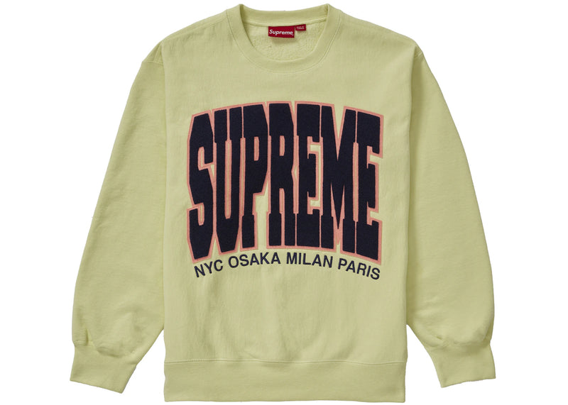 The Supreme Cities Arc Crewneck Pale Lime is now available at Side Kicks!