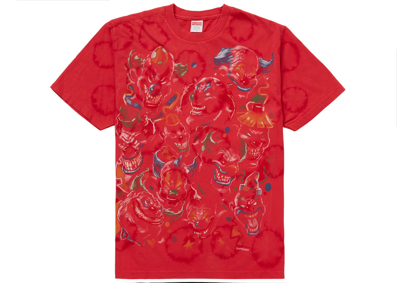 The Supreme Clowns Tee features multiple clown faces printed across a tie-dye design, available in four color options. Made from cotton, it offers a relaxed fit with short sleeves. Released...