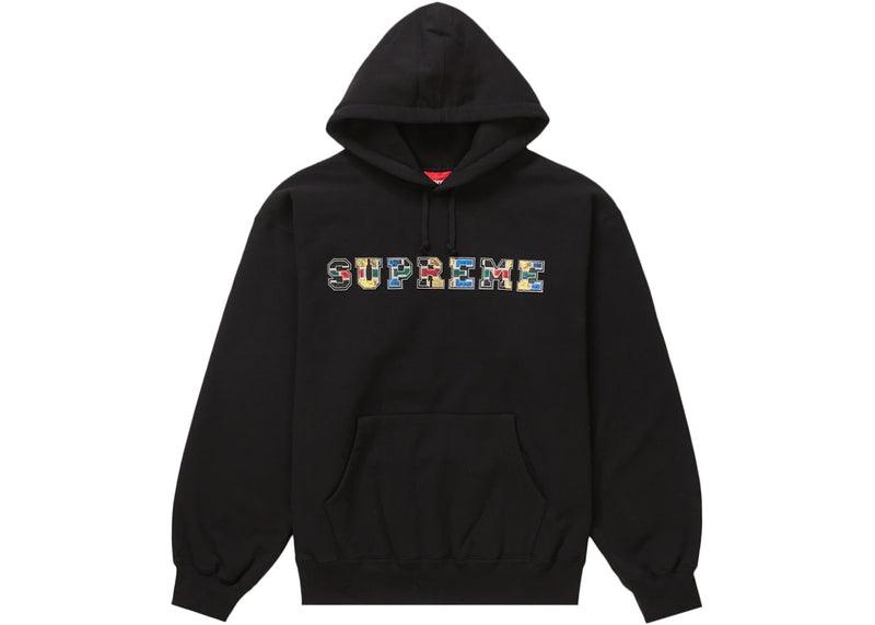 The Supreme Collegiate Patchwork Leather Hooded Sweatshirt Black is now available at Side Kicks!
