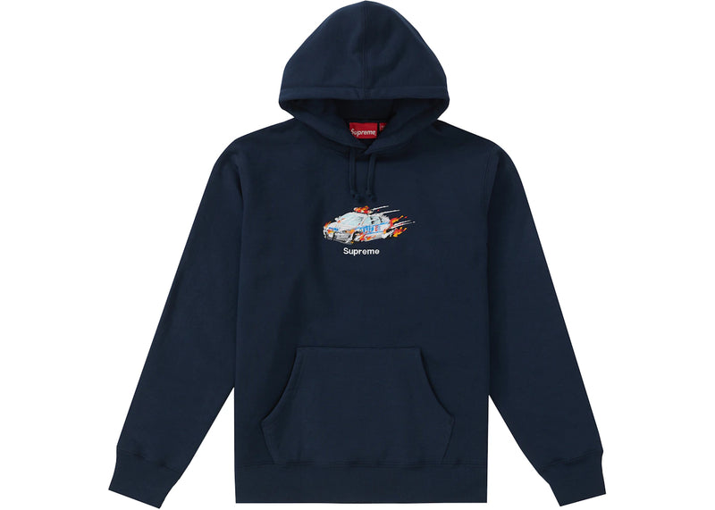 The Supreme Cop Car Hooded Sweatshirt Navy is now available at Side Kicks!