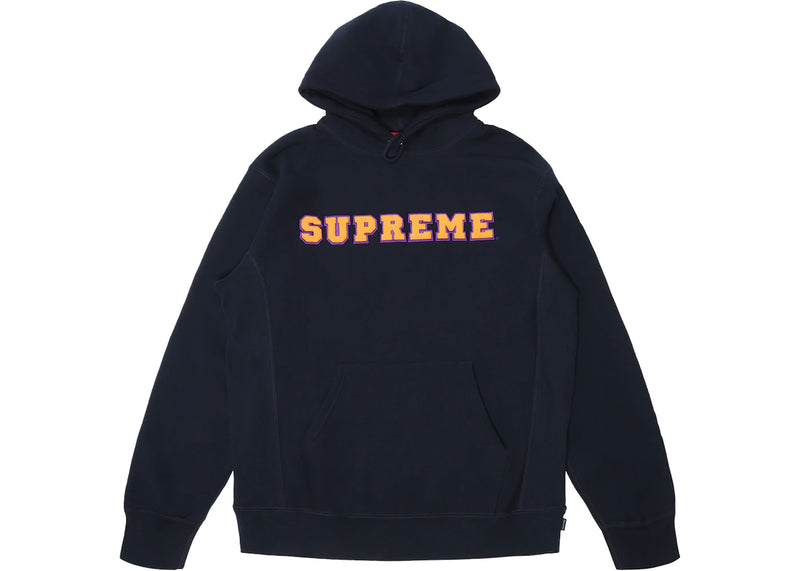 The Supreme Cord Collegiate Logo Hooded Sweatshirt Navy is now available at Side Kicks!