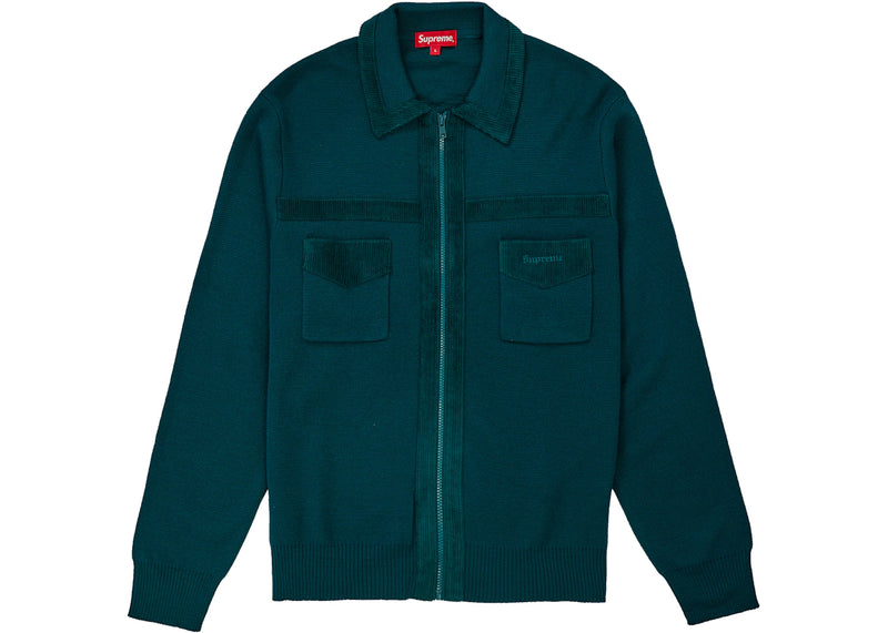 The Supreme Corduroy Detailed Zip Sweater Teal is now available at Side Kicks!