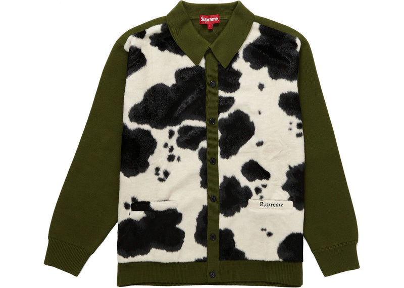 The Supreme Cow Print Cardigan Moss is now available at Side Kicks!