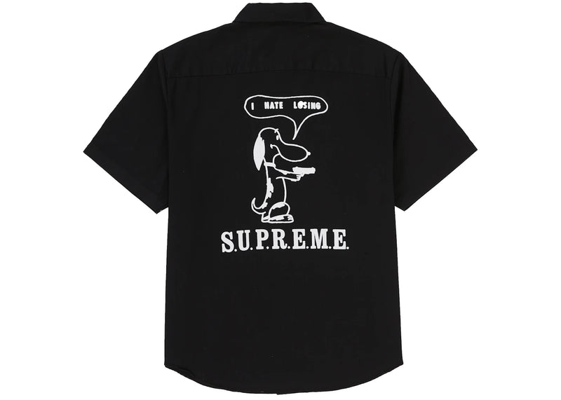 The Supreme Dog Short Sleeve Work Shirt features a printed Snoopy-like dog graphic on the back with the phrase "I hate losing" in a speech bubble. It includes an ironed-on...