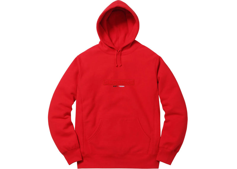 The Supreme Embossed Logo Hooded Sweatshirt (SS18) Red is now available at Side Kicks!