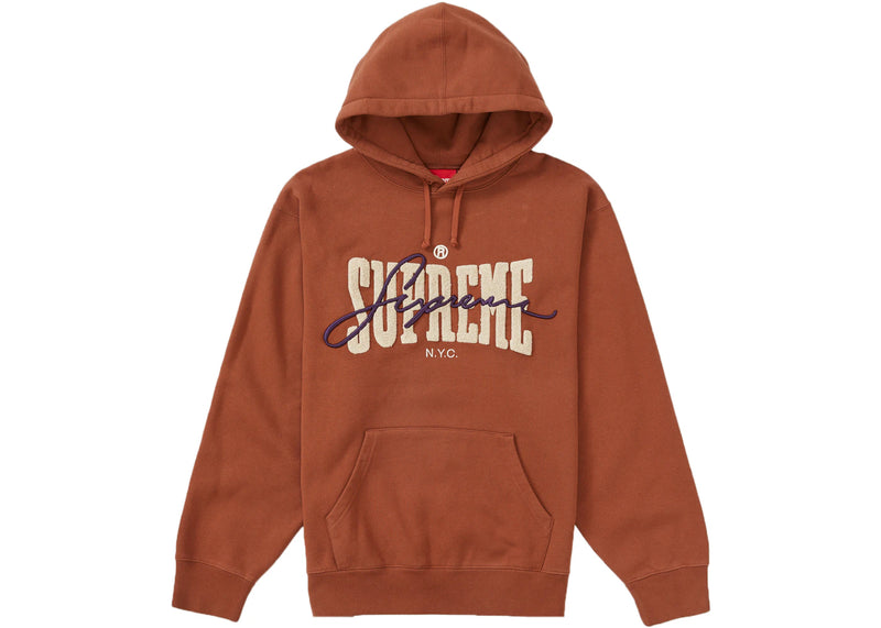 The Supreme Embroidered Chenille Hooded Sweatshirt Brown is now available at Side Kicks!