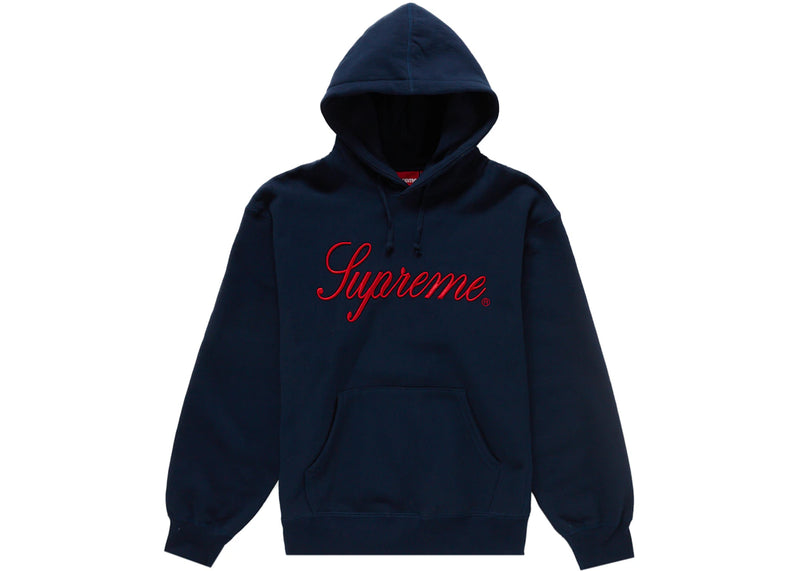 The Supreme Embroidered Script Hooded Sweatshirt Navy is now available at Side Kicks!