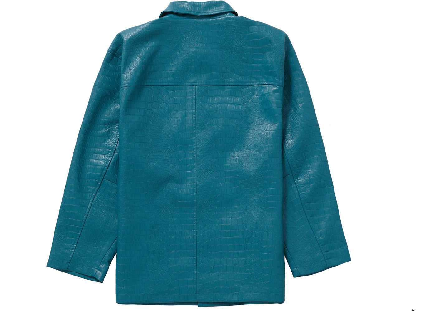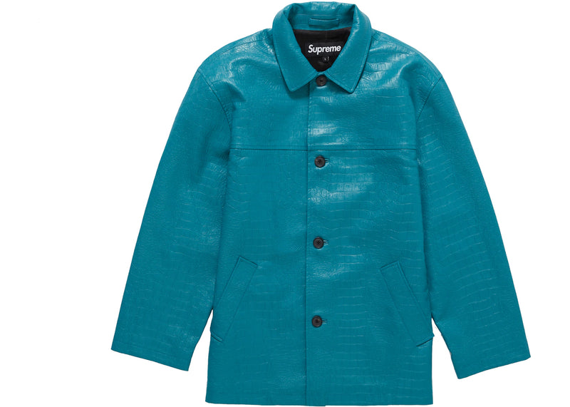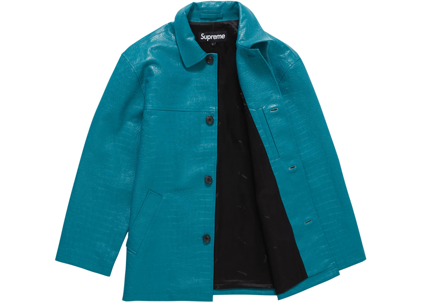 The Supreme Faux Croc Car Coat Teal is now available at Side Kicks!