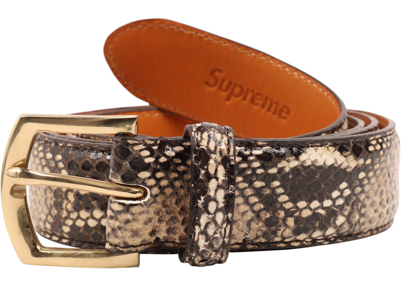The Supreme Faux Snakeskin Belt Tan is now available at Side Kicks!