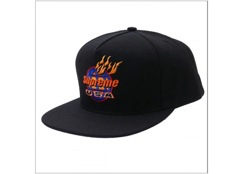The Supreme Fire Tee Black features a short-sleeve cotton construction with a crew neck and straight hem. The black base showcases a screen-printed graphic of orange and purple flames surrounding a globe, with "Supreme" in orange text and "USA" below. Released on December 14, 2017, the Supreme Fire Tee Black is available now at Side Kicks.