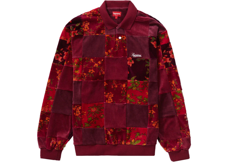 The Supreme Floral Patchwork Velour L/S Polo Cardinal is now available at Side Kicks!