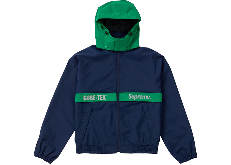 The Supreme GORE-TEX Court Jacket features waterproof and breathable GORE-TEX technology. Made from nylon with taped seams, it includes a removable hood, hand pockets, and a nylon lining. Supreme has a history of using GORE-TEX, notably in the 2017 North Face collaboration. Released on October 11, 2018, the Supreme GORE-TEX Court Jacket is available now at Side Kicks.