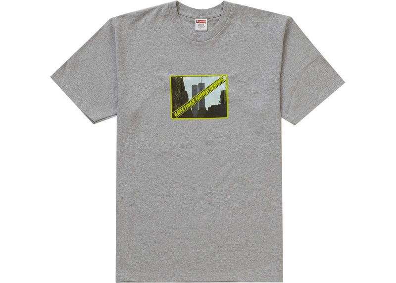 The Supreme Greetings Tee features a New York skyline graphic with "Greetings From Supreme" text, designed as a vintage postcard. Made from 100% cotton, it was part of the brand's...