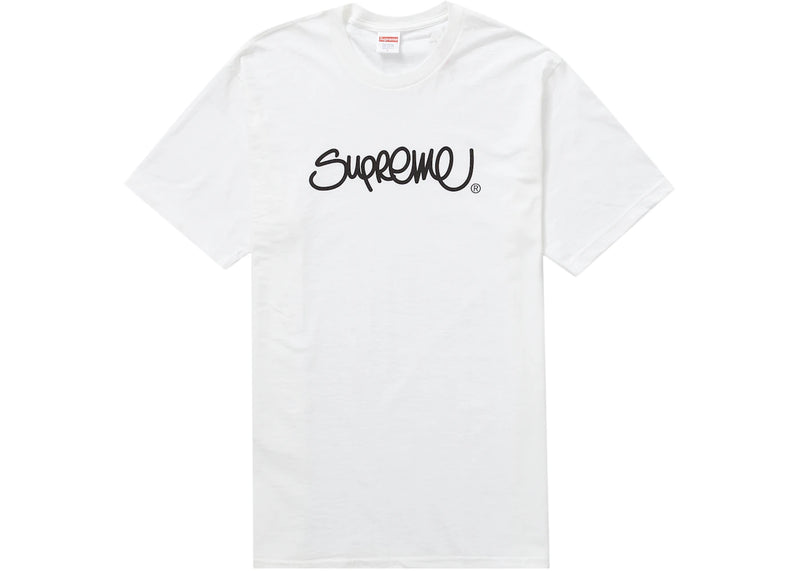 The Supreme Handstyle Tee White features a black handwritten logo print on the chest, inspired by the brand's signature design. It has a round neck, short sleeves, and a straight...
