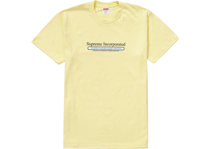 The Supreme Inc. Tee features a corporate-inspired design with "Supreme Incorporated" printed across the chest, accompanied by a pixelated box reading "Where Knowledge Reigns." It was released in eight color...