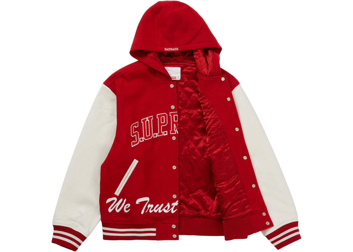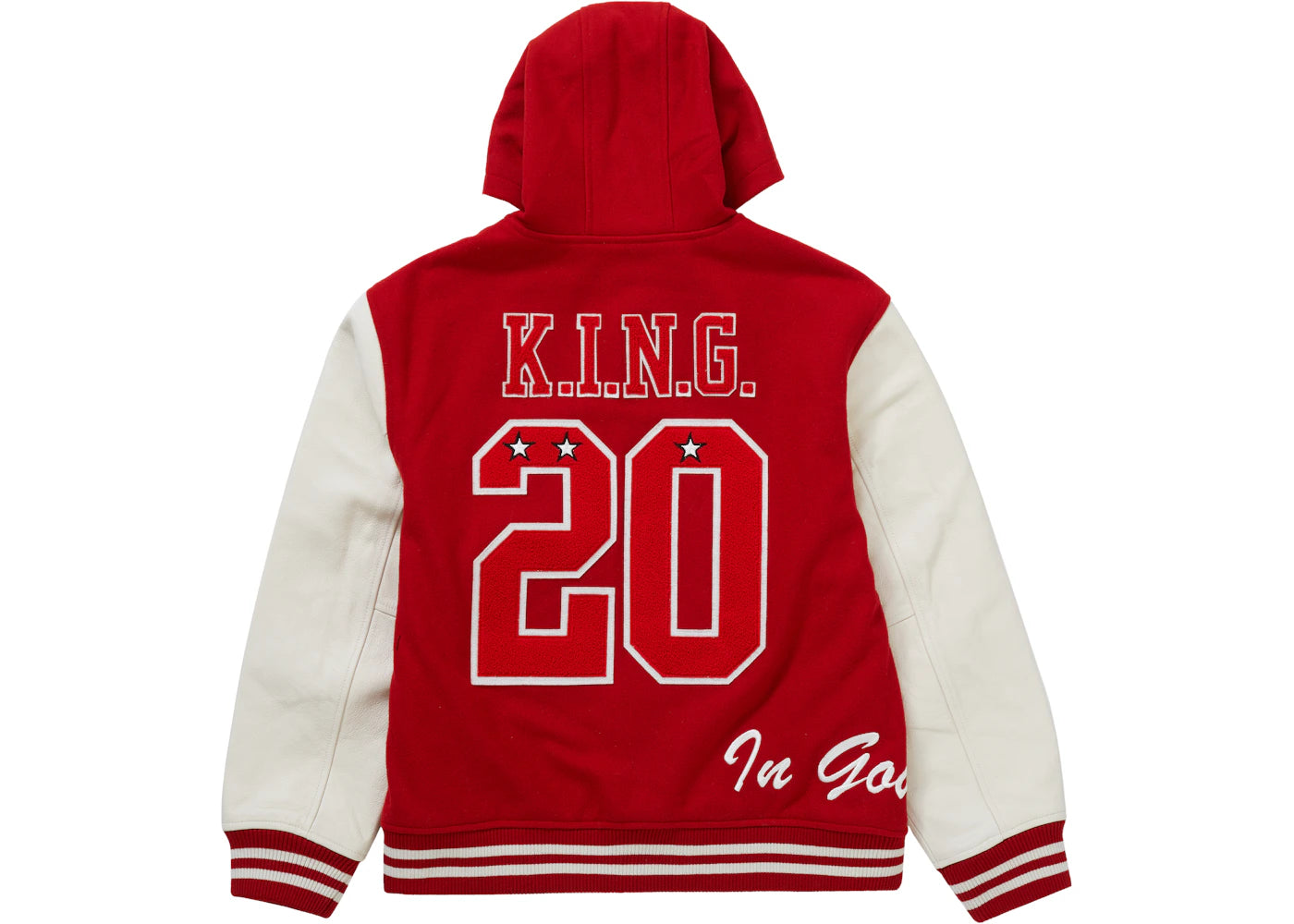 The Supreme King Hooded Varsity Jacket Red is now available at Side Kicks!