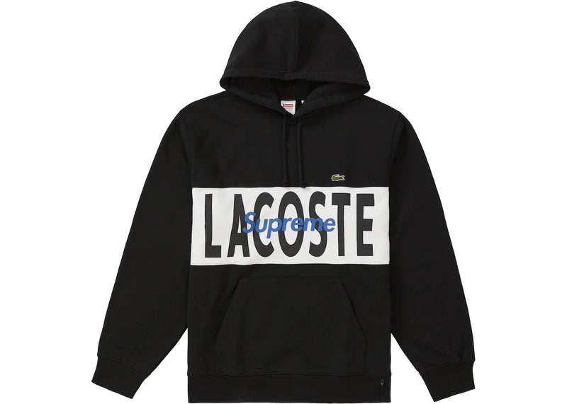 The Supreme LACOSTE Logo Panel Hooded Sweatshirt Black is now available at Side Kicks!