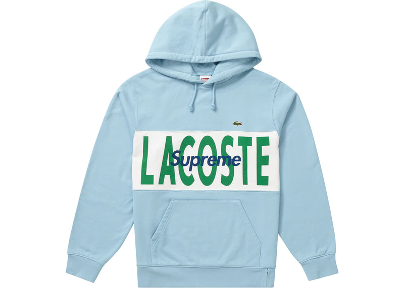 The Supreme LACOSTE Logo Panel Hooded Sweatshirt Light Blue is now available at Side Kicks!