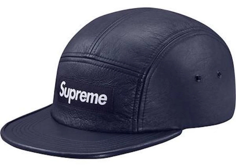 The Supreme Leather Camp Cap Royal is now available at Side Kicks!