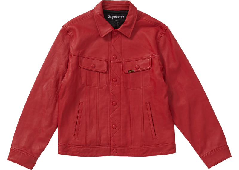 The Supreme Leather Trucker Jacket Red is now available at Side Kicks!
