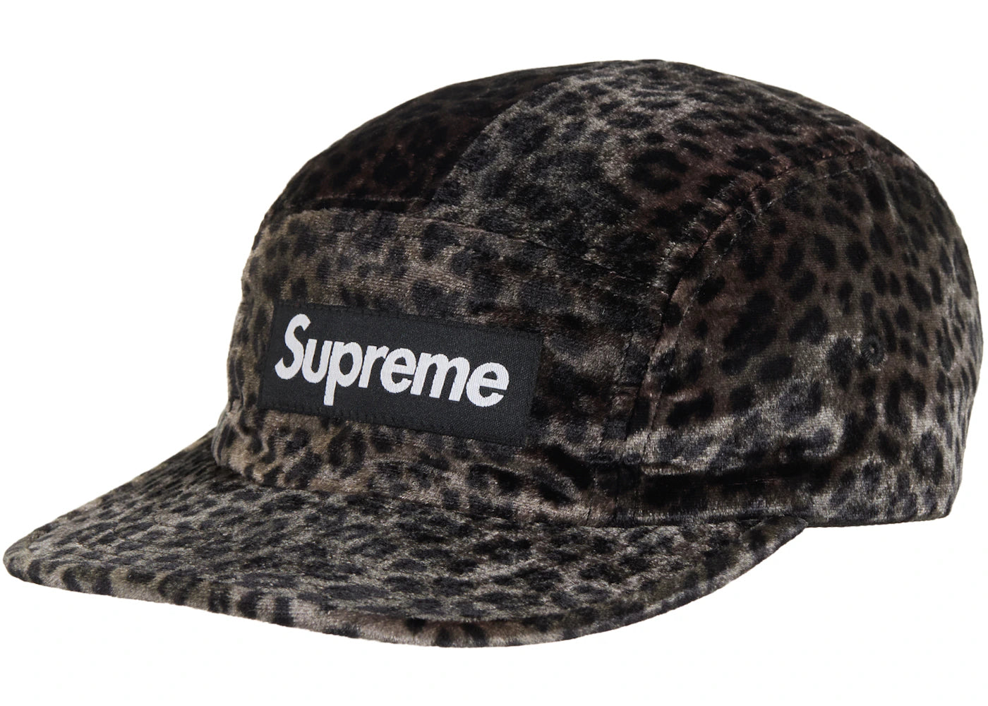 The Supreme Leopard Velvet Camp Cap Black is now available at Side Kicks!