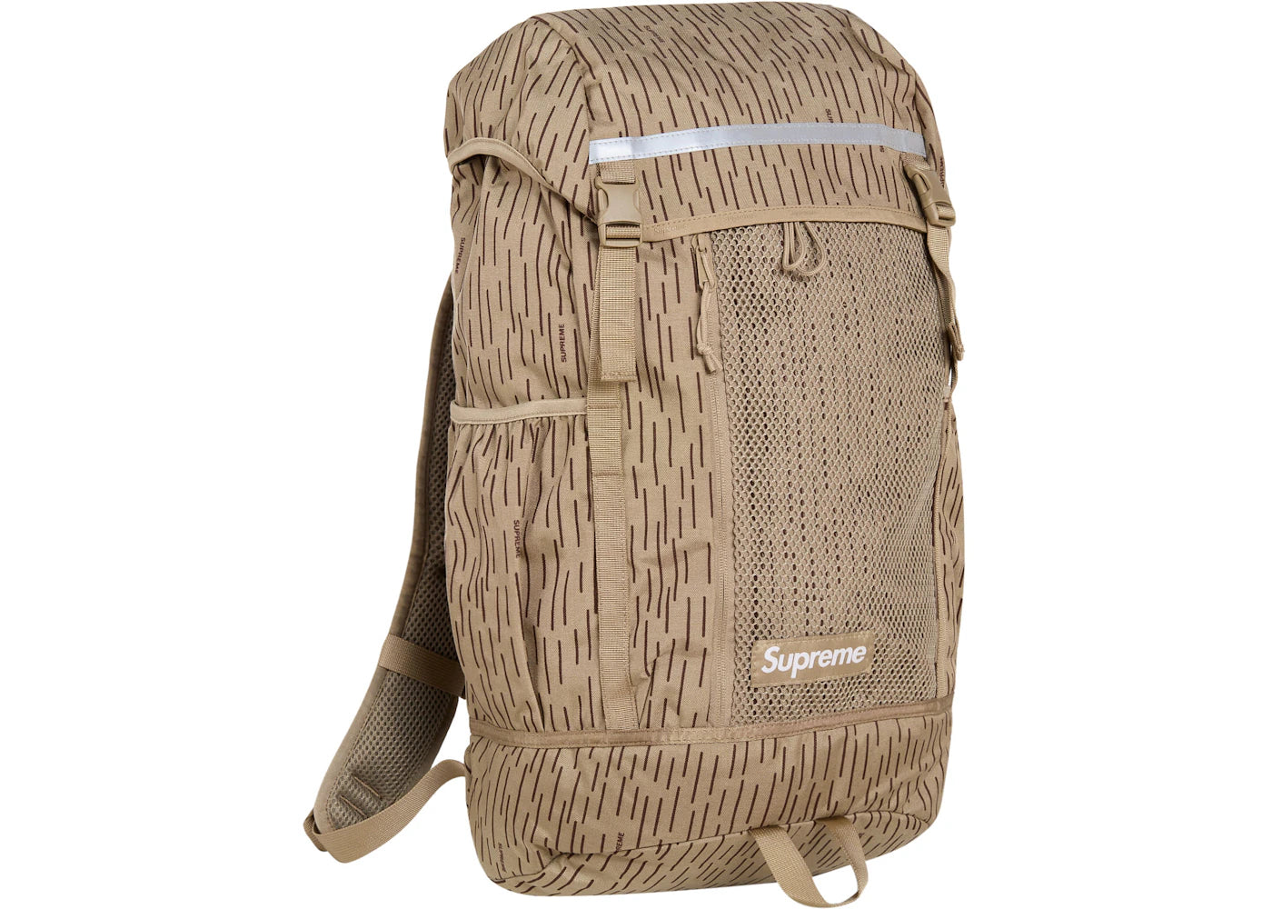 The Supreme Logo Backpack (FW24) Tan Raindrop is now available at Side Kicks!