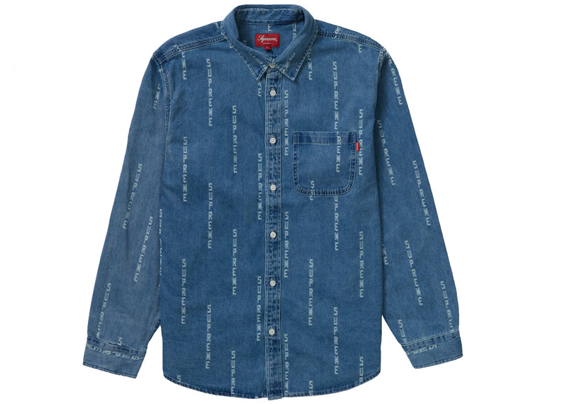 The Supreme Logo Stripe Jacquard Denim Shirt Blue is now available at Side Kicks!