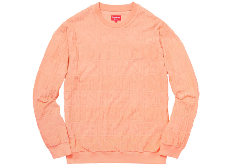 The Supreme Logo Stripe Terry Crewneck Peach is now available at Side Kicks!