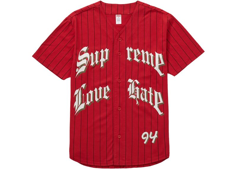 The Supreme Love Hate Baseball Jersey Red is now available at Side Kicks!