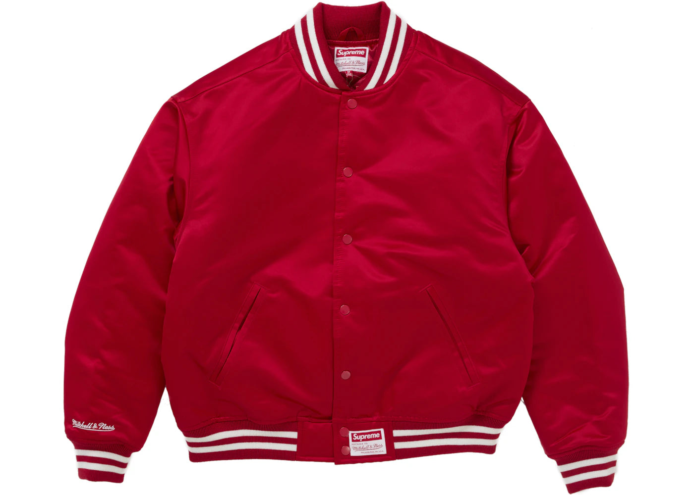 The Supreme Mitchell & Ness Satin Varsity Jacket (FW24) Red is now available at Side Kicks!