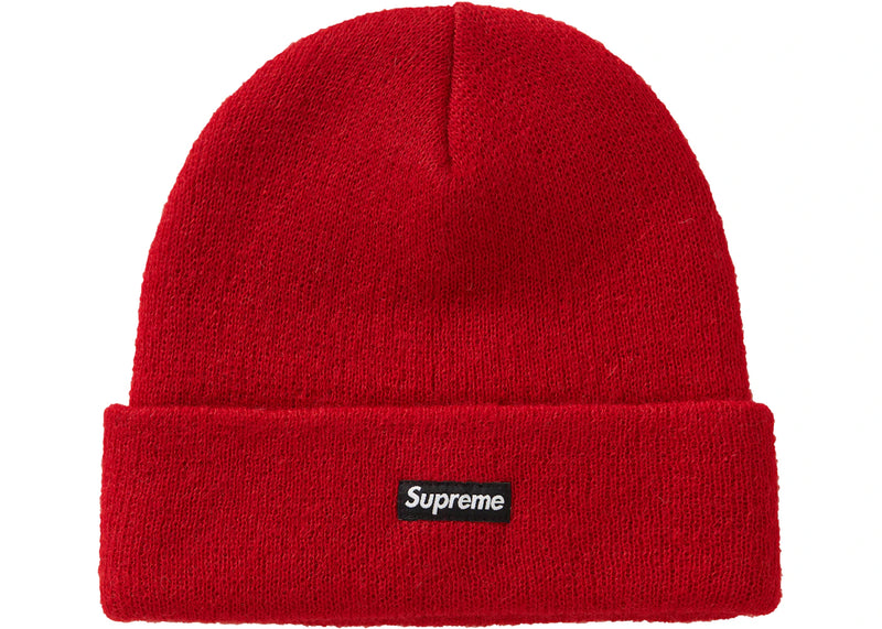 The Supreme Mohair Beanie FW19 White features a tight-knit jersey construction made from soft mohair yarn. Its fold-up cuff includes a woven red box logo label with white Futura lettering...