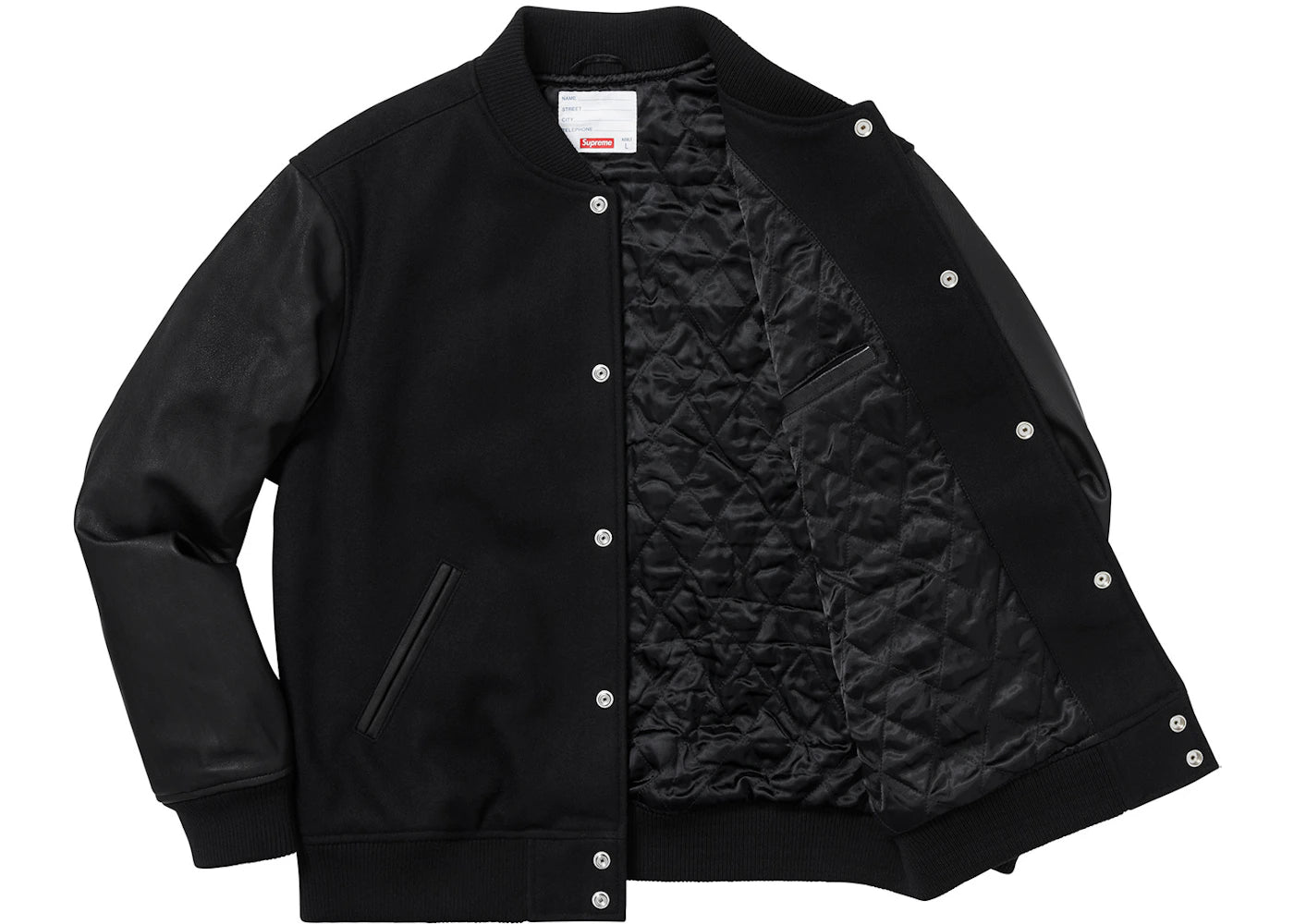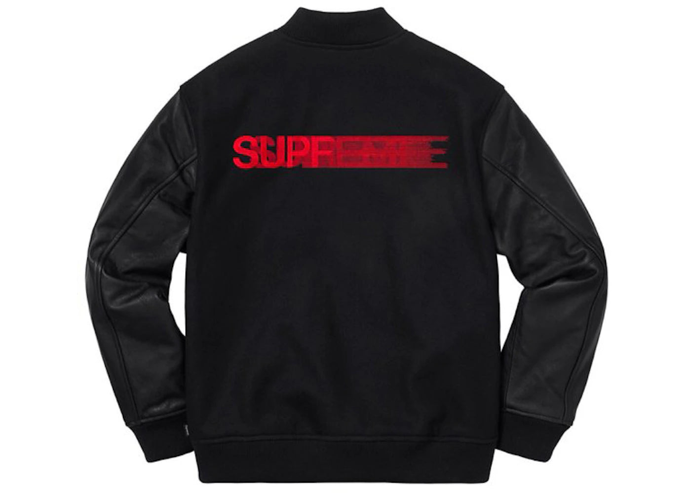The Supreme Motion Logo Varsity Jacket Black is now available at Side Kicks!