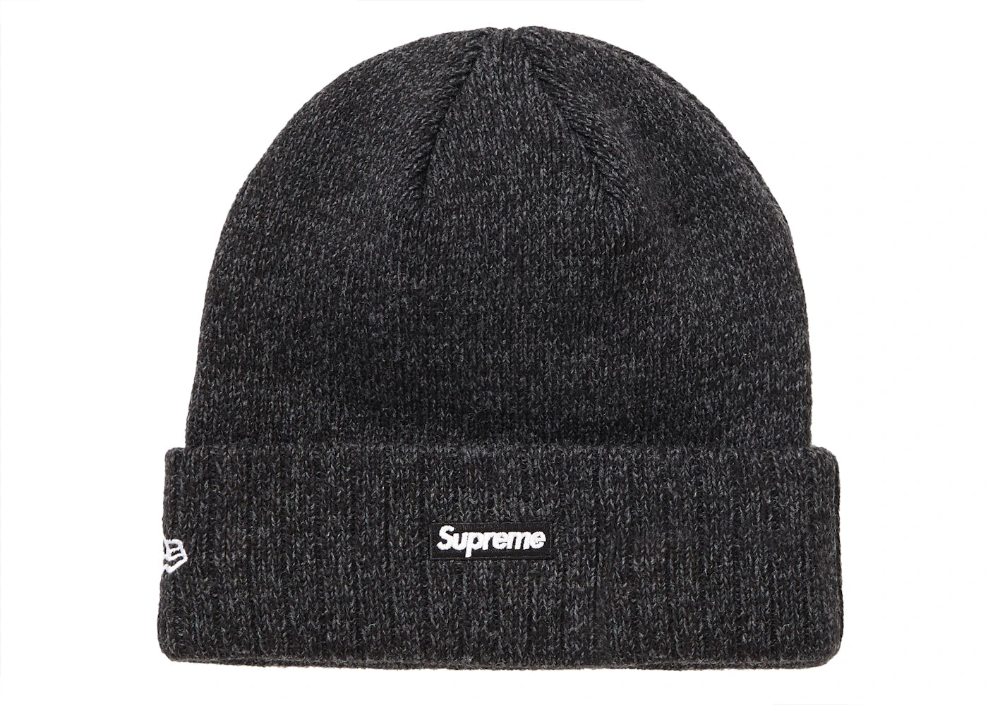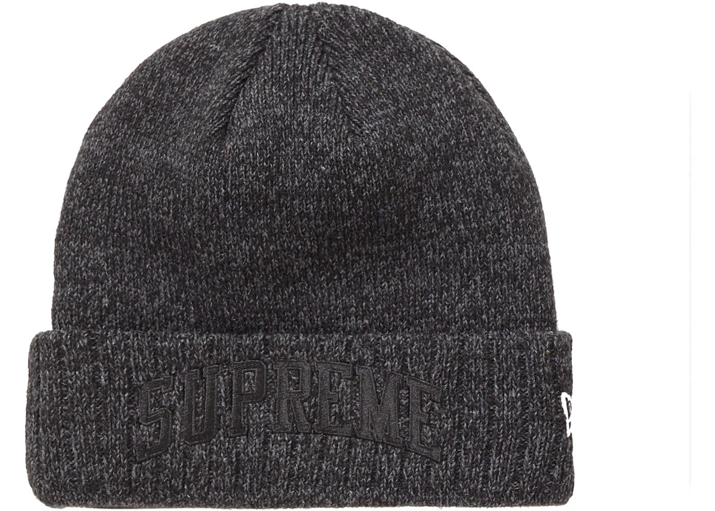 The Supreme New Era Big Arc Beanie Black features a thick acrylic construction with a foldable cuff. The design includes a large black chenille Supreme logo outlined in white, arching...